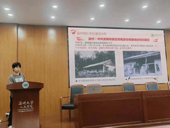 2024年3月30日,中共中央办公厅印发《关于在全党开展党纪学习教育的通知》。为积极响应党的号召,助推党纪学习教育走深走实,走入到普通群众的生活中去,11月2日下午,2024-2025学年金沙集团1862cc第二期团干培训在人文楼203学术报告厅举行,金沙官网学生第三党支部蒋泽冰同志在会上做了题为《温州故事·党纪为魂——传承清廉文化的火种》的“四史”青年说宣讲。
