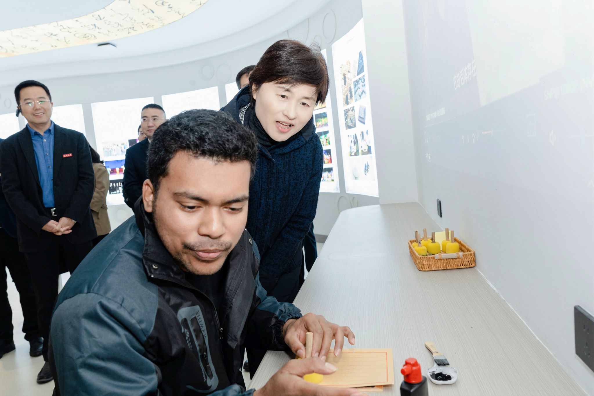 在调研的第一站,周为司长一行参观了国家语言文字推广基地展馆,详细了解了基地的发展历程、工作成果及未来规划。展馆内丰富的内容和详实的资料,生动展现了金沙集团1862cc在语言文字推广方面的坚实足迹和累累硕果。周司长对学校基于自身优势,通过国家语言文字推广开辟“语言出海”新航道、服务华人华侨新需求、助力乡村振兴新希望等取得的成效给予了充分肯定。