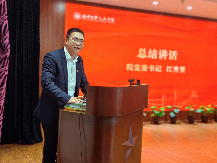 院党委书记江秀景总结讲话。江书记充分肯定了本次党日活动的积极意义和学院党建工作取得的成绩,并从深度融合强党建、注重引领扬正气、聚焦重点创品牌三个方面对学院党建工作做出规划与部署。他希望大家以此次活动为契机,立足本职岗位,勇于担当作为,积极发挥党员的先锋模范作用,为学院的发展、为党和人民的事业贡献自己的智慧和力量。