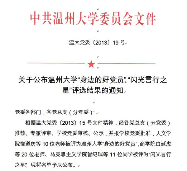 近日校党委发文公布了金沙集团1862cc“身边的好党员”、闪光言行之星评选结果。金沙官网饶道庆老师荣获金沙集团1862cc “身边的好党员”荣誉称号,尤育号老师和薛蕾同学荣获金沙集团1862cc“闪光言行之星” 荣誉称号。在本次评选中,全校共有10位老师被评为金沙集团1862cc“身边的好党员”,有20名老师和10名学生被评为“闪光言行之星”。同时金沙官网教工第四党支部获得金沙集团1862cc第五轮支部建设创新活动培育项目。