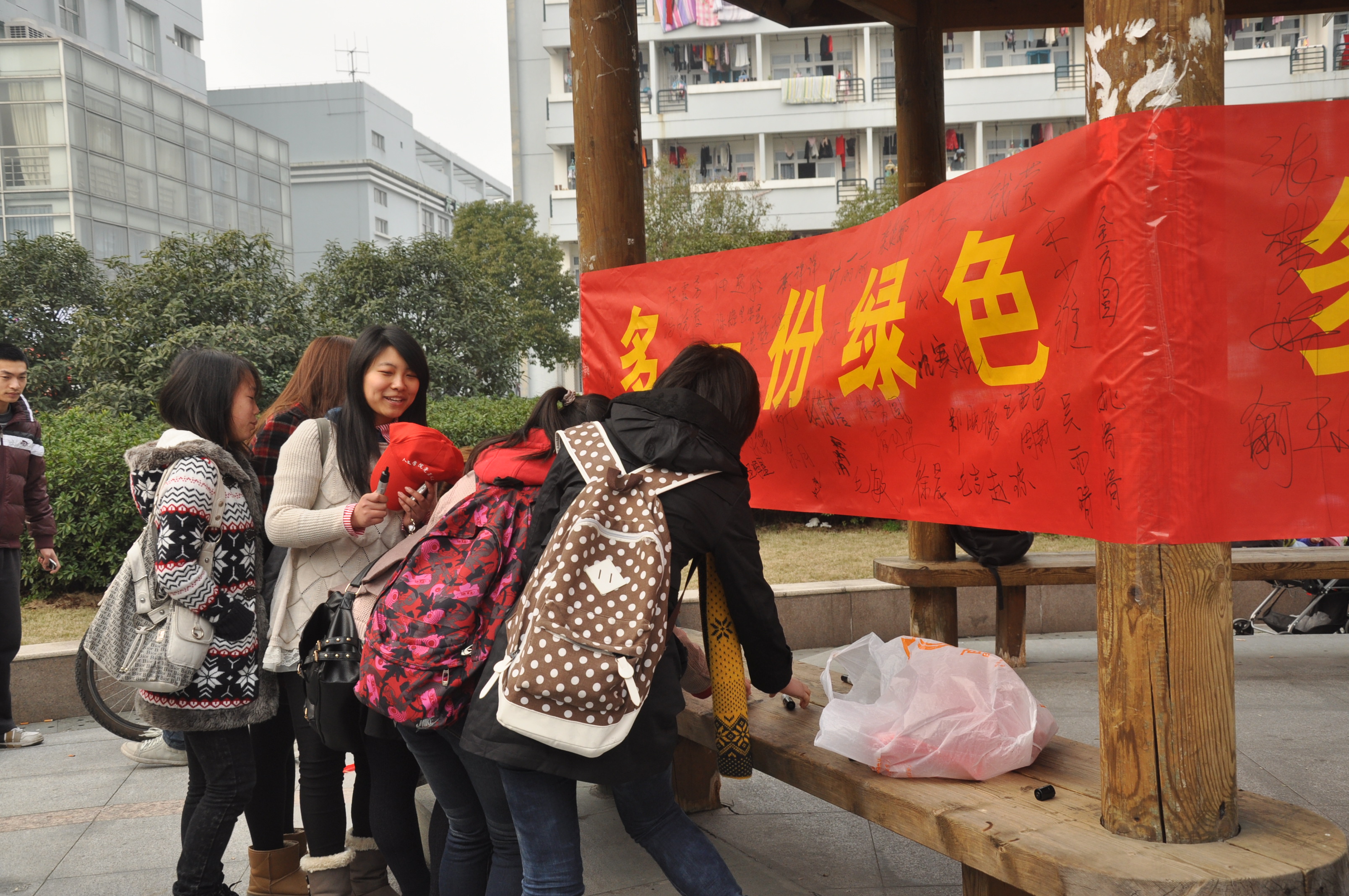 下午4时,C区凉亭再一次被围堵得密不透风。我们拿出事先准备好的红色大横幅,预备党员们把横幅绕着凉亭的柱子转了一圈后固定住,然后纷纷在上面签名或者是写植树节宣言。不一会儿,横幅上就凸显出密密麻麻的字迹,从中透露着热情。其间,有不少预备党员向我们提出了一些关于植树节宣传活动的好点子,比如,真枪实干地去植树、看相关的环保宣传片、进行一次爱护幼苗活动等等。最后,预备党员们把宣传横幅挂了起来,希望能号召起更多的人加入我们地球家园的绿色行动。