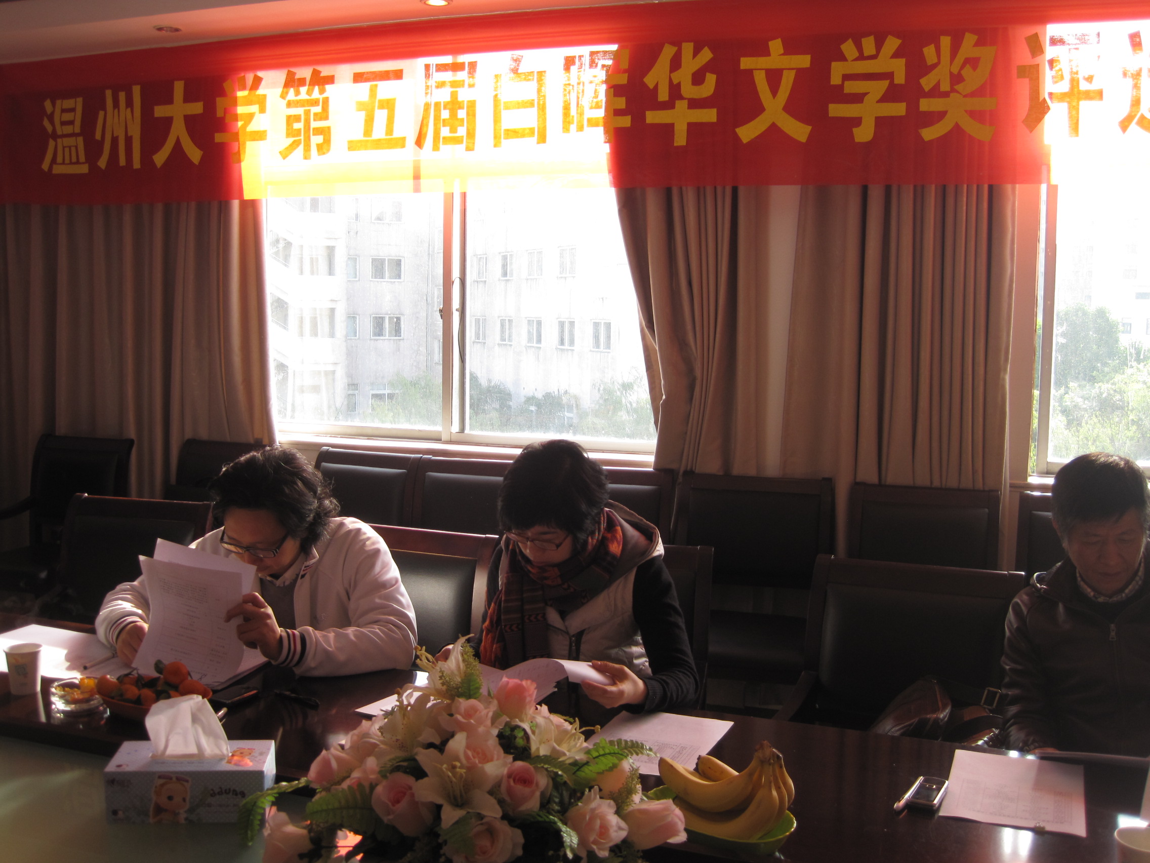 2011年12月10日上午九点,期待已久的金沙集团1862cc第五届白晖华文学奖终审评审会于学院路校区行政楼四楼会议室隆重召开。副校长叶世祥、宣传部部长潘玉驹、金沙集团1862cc党总支书记周剑平等领导参加,另外我们还荣幸邀请到了邀请了作家李涛、温州日报记者朱闻武、金沙集团1862cc孙良好教授、陈小碧博士等参加终审。
