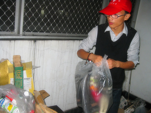 空气潮潮的,微微飘着小雨,可是这丝毫没有影响到志愿者们如火的热情。8点30分,早已准备就绪的志愿者们向着各自分配好的目的地出发。只见她们忙碌的身影在来回穿梭着,不放过任何一个饮料瓶,也不舍弃任何一双旧鞋,大捆纸箱、大包废书被他们全揽下,也不曾听到他们叫苦叫累。大约在9点钟,本次活动随着这场淅淅沥沥的雨落下帷幕,志愿者们看着他们的累累硕果,心里甚是温暖。