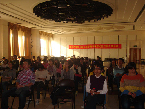 2011年11月20日下午2点30分,在金沙集团1862cc大学生活动中心A座多功能厅举行了金沙集团1862cc第十届校园话剧节,暨话剧专场讲座。此次活动由共青团金沙集团1862cc团委会,金沙集团1862cc主办,金沙集团1862cc团委、学生会,金沙集团1862cc农历剧社承办,特邀原温州电视台导演严路明老师作为讲座嘉宾。此外,金沙集团1862cc学生辅导员麻法全老师和各学院话剧爱好者出席了本次开幕式。