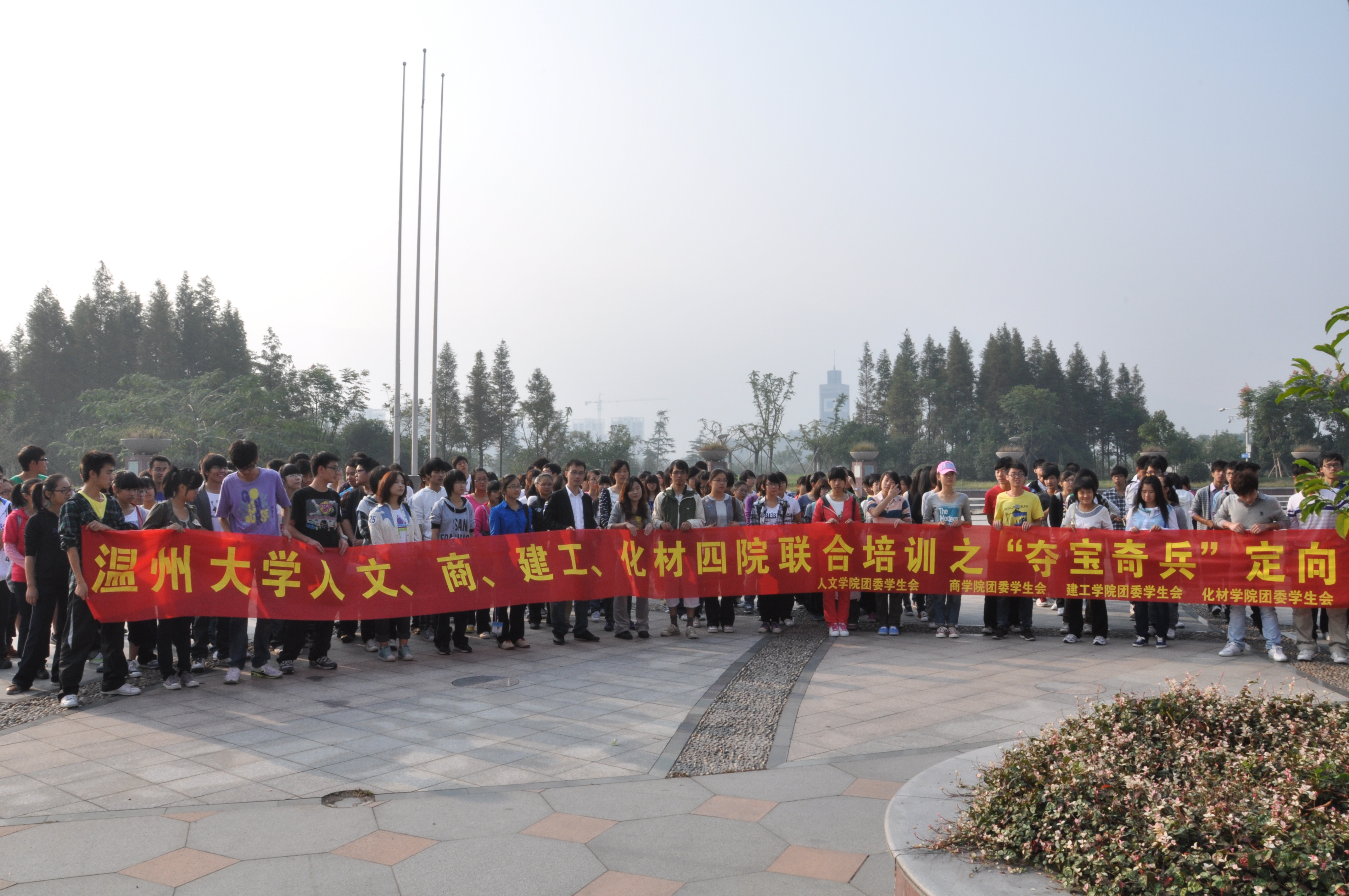 2011年10月22日上午8点,由人文、商、建工、化材四院组织的团干联合培训之“夺宝奇兵”定向运动比赛在大学生活动中心盛大开幕。参加本次开幕的有金沙集团1862cc团委麻法全老师,商学院团委学生会李丽老师,化材学院团委田明伟老师。