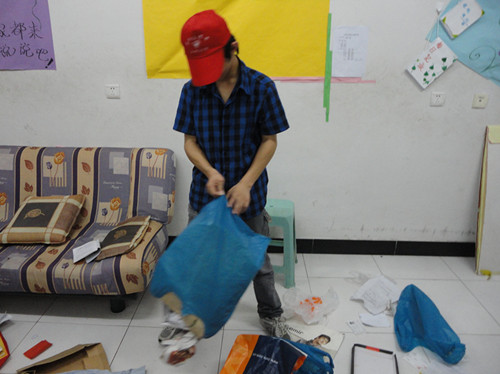 该日晚八点半,活动正式开始。首先,负责人将分工表分发给各个志愿者,各位志愿者分别根据自己所拿到的任务,进行分组,然后到自己负责的寝室楼开始回收旧物。本次活动与之前相比,有所不同。之前,志愿者都亲自将旧物从寝室里搬至指定地点。这次,志愿者人数减少,各志愿者工作任务不同,个别志愿者去寝室楼里,通知各位学生,请他们自己将旧物搬到楼下;而某些志愿者则在寝室楼下等待同学们的旧物,然后再将它们搬到指定地点。在志愿者们与同学们交流的过程中,志愿者们能礼貌地对待每一位同学,并帮助有特殊情况的寝室将旧物搬到楼下,大家都合作得很和谐。三十分钟左右,旧物回收结束,各位志愿者们又在C8-120对旧物进行了整理,以便于存放。在整理的过程中,各位志愿者积极性都很高,1个小时左右,就将本次大量旧物整理完成。