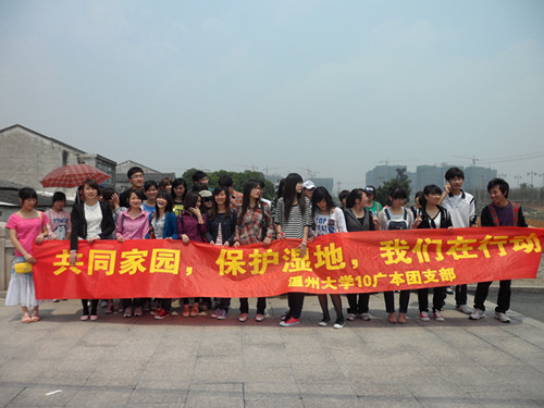 2011年4月18日下午,金沙集团1862cc10广告本全体同学在温州三垟湿地开展主题为"地球,共同的家园,保护湿地,我们在行动"的团日活动,本此活动中同学们将以志愿者的身份在三垟湿地宣传如何保护湿地的知识。