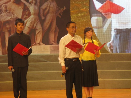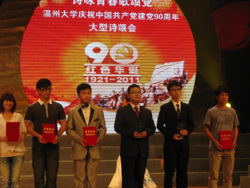 开幕式后举行“诗咏青春歌颂党”建党九十周年大型诗歌朗诵会,全校来自二级学院及部门选送十个朗诵节目恢弘演绎咏志情怀。金沙集团1862cc选送的群颂《我的祖国》以飒爽的英姿亮相舞台,在场师生掌声不断,来自金沙官网的80名学生代表高呼“文韬武略,扬我人文”,充分展示了人文学子的良好精神风貌。最后校党委书记陈福生、副书记林娟娟与金沙官网党总支副书记骆锤炼老师等全校师生代表共同演绎原创诗朗诵《党建纪元逾九十 歌颂党史唱温大》,令全场激情澎湃、荡气回肠,晚会达到高潮。大会在全场起立齐唱校歌的庄严氛围中,将爱党荣校的精神“润物细无声”深植入了全体温大人的心中。在上周三上演的庆祝建党九十周年诗歌朗诵大赛中,《我的祖国》获得群诵组第二名的好成绩,同时也荣获了“优秀创作奖”奖项。