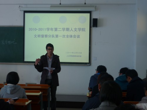 3月16日下午1:30,2010-2011学年第二学期金沙集团1862cc文明督察分队第一次全体会议在1-105教室准时举行。此次会议由金沙集团1862cc团委组织部负责,辅导员麻法全老师出席,文明督察队的各成员参加。