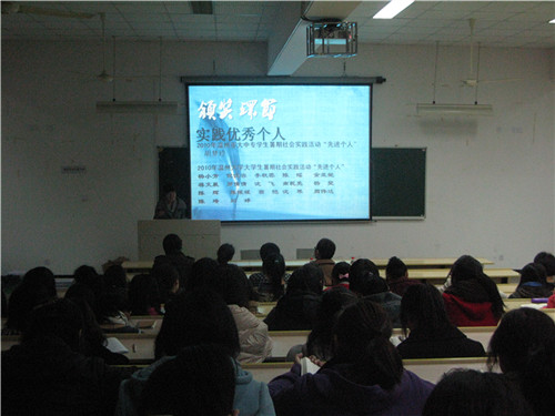 大会伊始,主持人向大一的同学介绍了暑期实践活动的要求和任务,以便同学们了解暑期实践活动的重要性。紧接着,金沙集团1862cc学生会主席陈辉向大家做了2010年暑期社会实践成果总结。然后,大会进入高潮阶段--颁奖典礼。这些奖项分别是:优秀实践基地、优秀实践团队和实践优秀个人。其中金沙集团1862cc“探寻泰顺特色文化”暑期社会实践队、金沙集团1862cc“点燃希望,放飞梦想”暑期社会实践队和金沙集团1862cc“探究温州民企社会责任慈善助学模式调研”暑期社会实践队荣获了2010年温州市大中专学生暑期社会实践活动“优秀团队”的称号。然后,金沙集团1862cc实践中心负责人张建增为大一同学做了2011年暑期社会实践活动方案指导,意在让大家对社会实践活动有更加明确的了解。随后,麻老师对暑期实践活动做了进一步的总结。麻老师指出“受教育,长才干,做贡献”是我们举行这个活动的主要目的。他还通过大学生为留守儿童和农民工子弟补课等例子生动地为大家讲解了实践活动对学生和社会的意义。最后,荣获“优秀团队”称号实践队的队长罗倩倩和沈芳展示了各自团队在暑期实践活动中的风采。