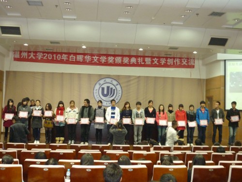 12月22日14点40分,金沙集团1862cc第四届白晖华文学奖颁奖典礼暨文学创作交流会在北校信息楼报告厅准时举行。白晖华文学奖评选活动由金沙集团1862cc党委宣传部、共青团金沙集团1862cc委员会、金沙集团1862cc联合主办,金沙集团1862cc团委、学生会承办。出席本次活动的嘉宾有白晖华文学奖赞助人、著名作家吴明华先生,金沙集团1862cc副校长叶世祥教授,白晖华文学奖理事会执行理事、温州日报文体部主任朱闻武先生、金沙集团1862cc党总支书记周剑平老师,金沙集团1862cc学生处处长王定福老师,金沙集团1862cc党委宣传部副部长全力老师,金沙集团1862cc团委副书记屠霁霞老师,金沙集团1862cc副院长饶道庆老师。