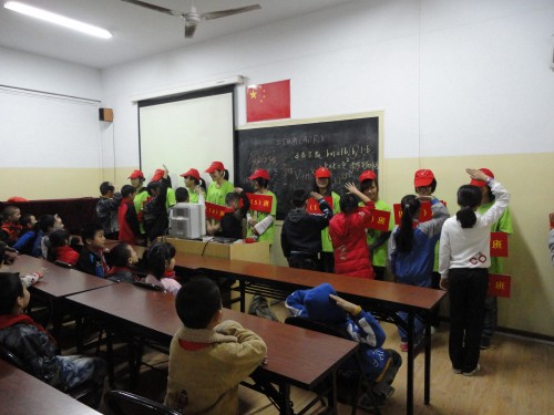 活动以各个班级授牌仪式开始:志愿者各举一个班牌在统一的口令中,把班牌庄重地递给每个班的代表。接着,志愿老师先让小朋友听《儿童交通安全歌曲》以及观看相关交通安全的视频资料,孩子们在津津有味的欣赏着的同时,并不时有讨论的声音,发表了个人对交通安全的看法。志愿者还给小朋友讲了许多常见的交通手势、交通安全知识以及一系列的交通法规秩序。一张张精美的PPT,丰富的交通安全知识不仅吸引了小朋友,连在场的志愿者们也认真地听着志愿老师的讲解。并且许多小朋友积极地举手发言,使课堂气氛十分活跃。最受小朋友欢迎的应该是“我是小小交通警”环节,一组组的小朋友上台示范做交警指挥的手势,并乐此不疲。