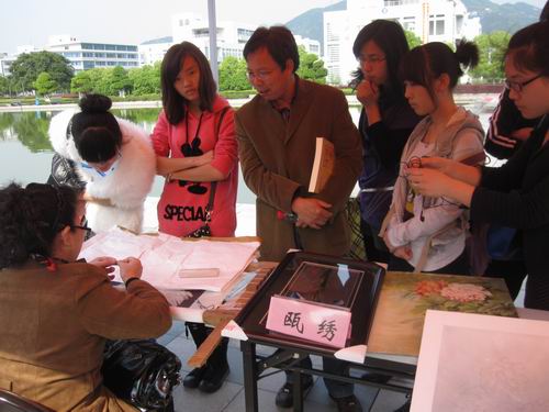 温州具有悠久的历史,从东晋明帝太宁元年建城开始至今已有1700多年的历史了。温州向来有“七山二水一分田”之说,这样的地理环境也为温州赢来了“百工之乡”的美称。近年来温州很多工艺都成了“全国非物质文化遗产”。本次活动由于很多美术家的参与,吸引了很多大学生的兴趣。本次活动在金沙集团1862cc北校区人工湖畔展开,现场热烈非凡,同学积极参与。大家怀着极大地好奇心在各个展柜前参观、学习并亲自实践。现场有道情表演、提线木偶和舞龙表演等,引来大家阵阵掌声。活动现场还有现场教你学剪纸的活动项目,许多同学都跃跃欲试,两百份红宣纸在同学手中很快都成了艺术品。