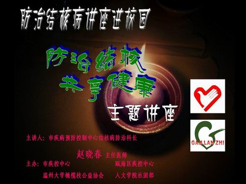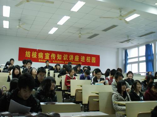 14:30,讲座准时开始.主持人金晓莹依次介绍到会人员,分别有:橄榄枝公益协会指导老师苏永强老师,结核病预防科科长赵晓春女士以及市疾病预防控制中心健康科科长陈镭科长。在同学们热烈的掌声中,由赵晓春女士主讲的防治结核病讲座正式开始。
