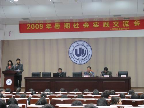 在观看了一段“教育时空”有关温大金沙集团1862cc2009年暑期社会实践的专题报道视频后,交流会正式开始。首先,麻法全老师向同学们介绍了2009年暑期社会实践活动的情况,并展示了各实践队的成果和心得感悟。而后,由主持人吴婕和院十佳歌手冠军郜波为大家带来优美的歌曲演唱《被风吹过的夏天》后,活动进入游戏环节。小游戏充分带动了在场同学的情绪,活动气氛渐渐热烈。接下来的交流活动以诗为名,别具一格。“小荷才露尖尖角”通过让大一同学对09社会实践图片的印象实践感悟和创意命名令同学们体会到了大学生对社会的责任感和关怀。“映日荷花别样红”的环节中,大一同学们尽情畅想将来暑期社会实践的计划,并由麻法全老师作出精彩的评点,提出中肯的建议。"道是无晴却有晴",各优秀暑期社会实践队的队长依次上台进行PPT成果展示,让大一同学感受到了真实的暑期社会实践生活。最后,冯建军老师和麻法全老师为本次活动作总结发言。