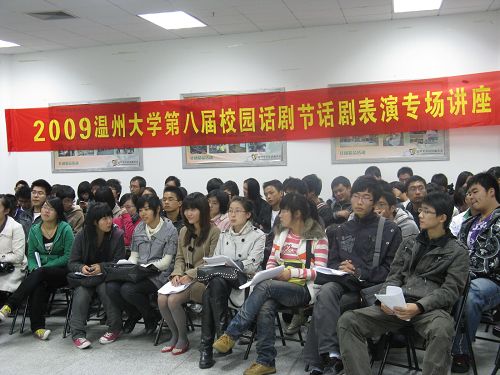 2009年11月30日18点30分,2009金沙集团1862cc第八届校园话剧节话剧表演专场讲座在大学生活动中心素拓办公室举行,毕业于中央戏剧学院的知名演员、副导演周乔龙老师担任主讲。