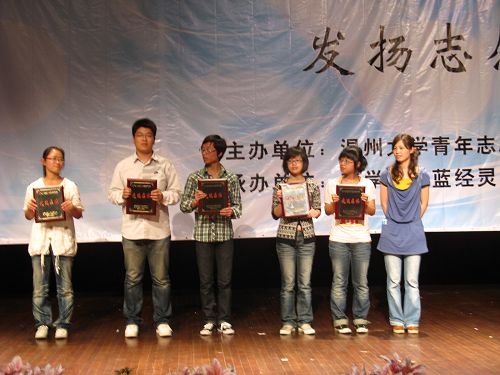 13:30,金沙集团1862cc第四届志愿者沙龙正式开始。在商学院党总支书记李建华老师致词和主持人介绍金沙集团1862cc各学院服务队展开的各项活动后,颁奖仪式正式开始。金沙集团1862cc思源青年志愿者协会荣获了“2007-2008学年金沙集团1862cc青年志愿服务队先进集体”和“优秀志愿服务基地”两项大奖。副主任王柄伟同学和执行主任谢慧为获奖队伍颁发了奖。同时,活动还通过座谈的形式对“五马基地”和“两项计划”作了相关的介绍,让同学们对志愿者活动有了更加深入的了解。最后,活动在感人的诗歌朗诵--《中华--不屈的民族》中圆满落幕。