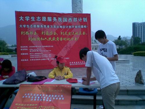 2009年5月4日,金沙集团1862cc校志愿者服务中心与金沙集团1862cc“思源”青年志愿者协会借“五四”这个光荣的日子,在金沙集团1862ccA生活区举行了“两项计划”的宣传活动。“两项计划”主要包括“大学生志愿服务我国西部计划”和“大学生志愿服务我省欠发达地区计划”。本次宣传活动旨在鼓励更多的应届毕业生投身到“两项计划”中去,为祖国建设做出自己的一份贡献。