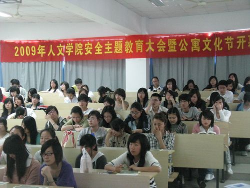 4月24日15:00,2009年金沙集团1862cc安全主题教育大会暨公寓文化节开幕式在人文楼203教室举行。金沙集团1862cc学生处处长倪建发老师、金沙集团1862cc党总支部书记周剑平老师、金沙集团1862cc党总支部副书记魏成春老师以及金沙集团1862cc学生科李浦豪老师出席了本次主题大会,金沙集团1862cc辅导员曾蓓蕾老师担任本次大会的主持人。
