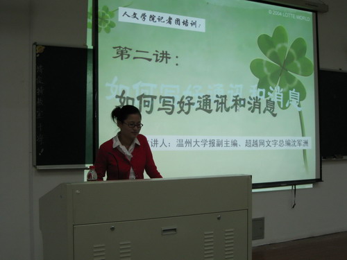 2008年11月8日晚7:00,金沙集团1862cc记者团培训第二讲"如何写好通讯和消息",在金沙集团1862cc1-101教室举行。本次讲座由《金沙集团1862cc报》副主编、超越网文字总编沈军洲主讲。
