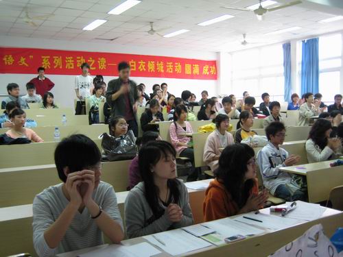4月16日下午2:00,金沙集团1862cc第六届"百年语文"系列活动之"读--白衣倾城"诗歌朗诵比赛在同学们热切的期盼中拉开了帷幕。比赛吸引了来自人文、瓯江、教育、商、外国语、数学与信息科学、机电工程等学院同学前来参赛、观看。金沙集团1862cc教授熊国太、辅导员曾蓓蕾、栖风文学社社长周远担任了本次比赛的评委。