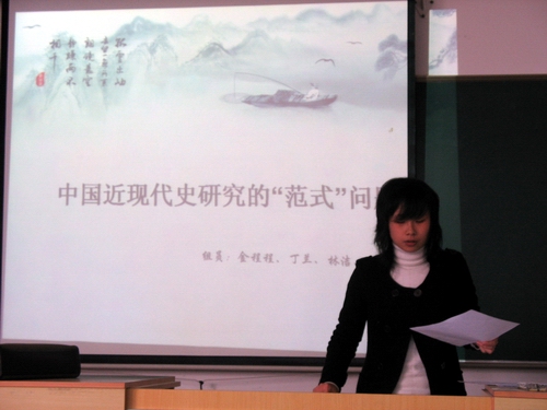 学术沙龙这种教学形式在我们班尚属第一次开展。在开展之前同学们都仔细翻阅了相关文献资料,以备与老师同学进行交流。沙龙开展期间同学们可随意饮用桌上已备好的水果及食品,形式自由开放,同学们都热情高涨。沙龙开始由杨博士对讨论话题作了个简要的介绍,接着由各小组的同学派代表上台对自己小组的意见进行阐述。讨论的中国近现代史研究“范式”问题,有的小组倾向于“革命史范式”,有的倾向于“现代化范式”,也有的倾向于两种范式共存。阐述完之后进行自由讨论,我们班的最大特点就是思路广阔,不拘一格,所以此轮环节最精彩。同学们引经据典,各抒己见,侃侃而谈,不亦乐乎。