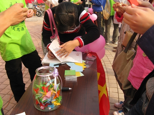 此次活动吸引了各大学院数百名同学的关注,广大同学大力支持,积极主动地过来为袁卡凤祝福,有些还自愿留下来帮忙,教那些不会的同学一起折纸鹤。活动中,还有一位日本退休老教授和几位国外留学生献上了自己的爱心,虽然不是同一个民族,但爱心是无国界的。