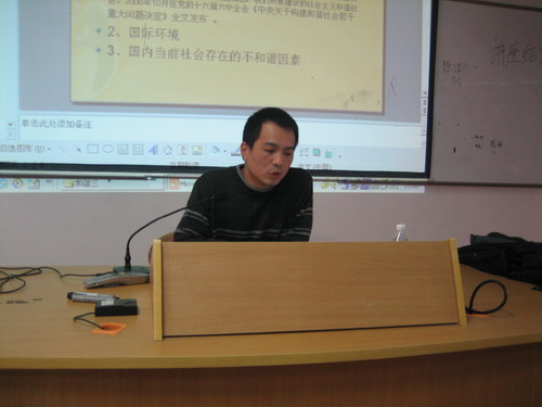 12月27日下午三点,在1号楼203及2号楼203分别举行了由金沙集团1862cc院党总支书记周剑平及学生科辅导员李浦豪老师主持的有关于形势政策教育之构建和谐社会的讲座。