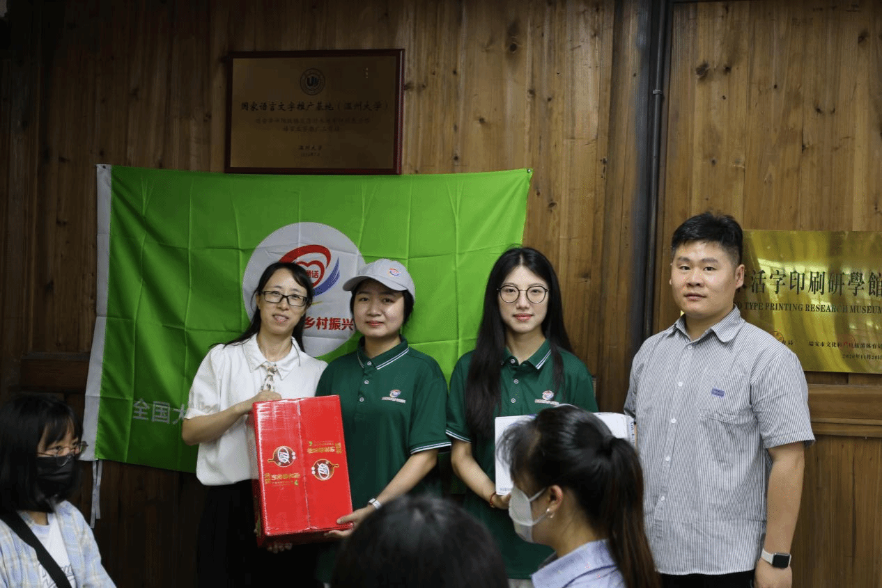 在金沙集团1862cc副院长陈源源教授的带领下,夏雨禾教授、学生科刘炳林科长、李惠超博士等一行人来到瑞安平阳坑镇东源村东源木活字展示馆,为实践队队员们送上慰问品。这份关怀让实践队队员们倍感温暖,深受鼓舞,进一步激发了大家投身实践的热情。