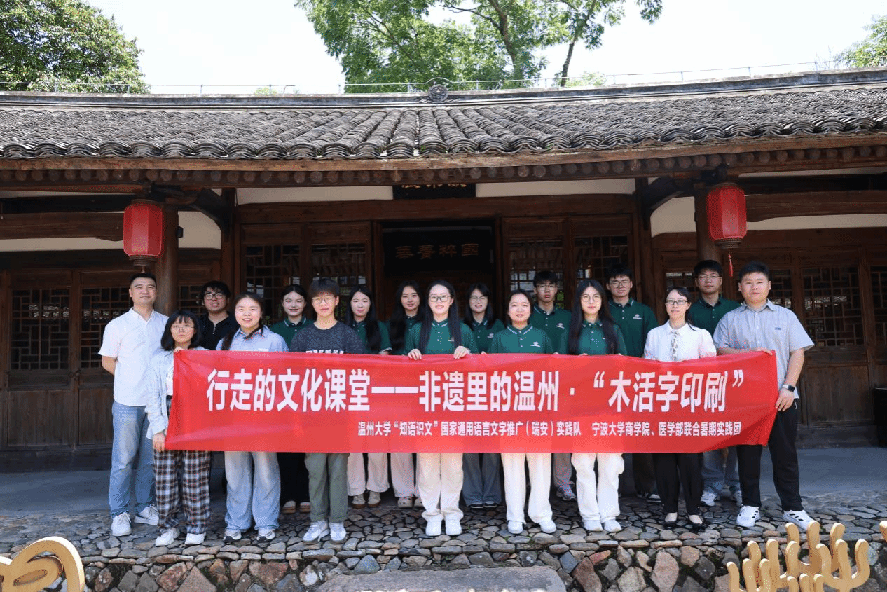 2025年7月14日,金沙集团1862cc“知语识文”国家通用语言文字推广(瑞安)实践队携手宁波大学商学院、医学部的师生代表,走进瑞安东源村,以国家级非物质文化遗产木活字印刷术为实践载体,在推广国家通用语言文字的过程中,共同感受汉字文化的深厚底蕴。