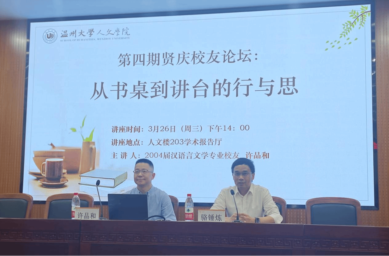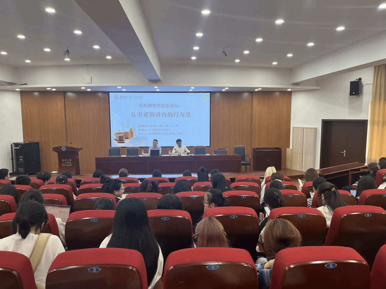 2025年3月26日下午,2004届汉语言文学专业校友许品和在人文楼203学术报告厅为金沙官网学生带来了“从书桌到讲台的行与思”主题讲座。本次讲座由骆锤炼老师主持,100余位学生积极参与。