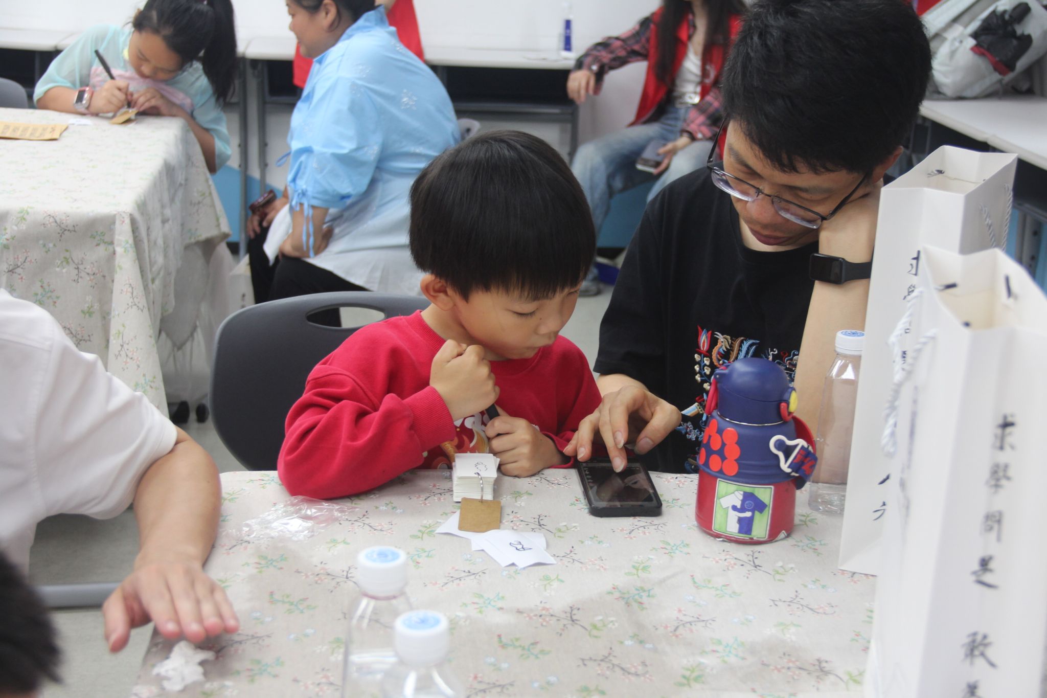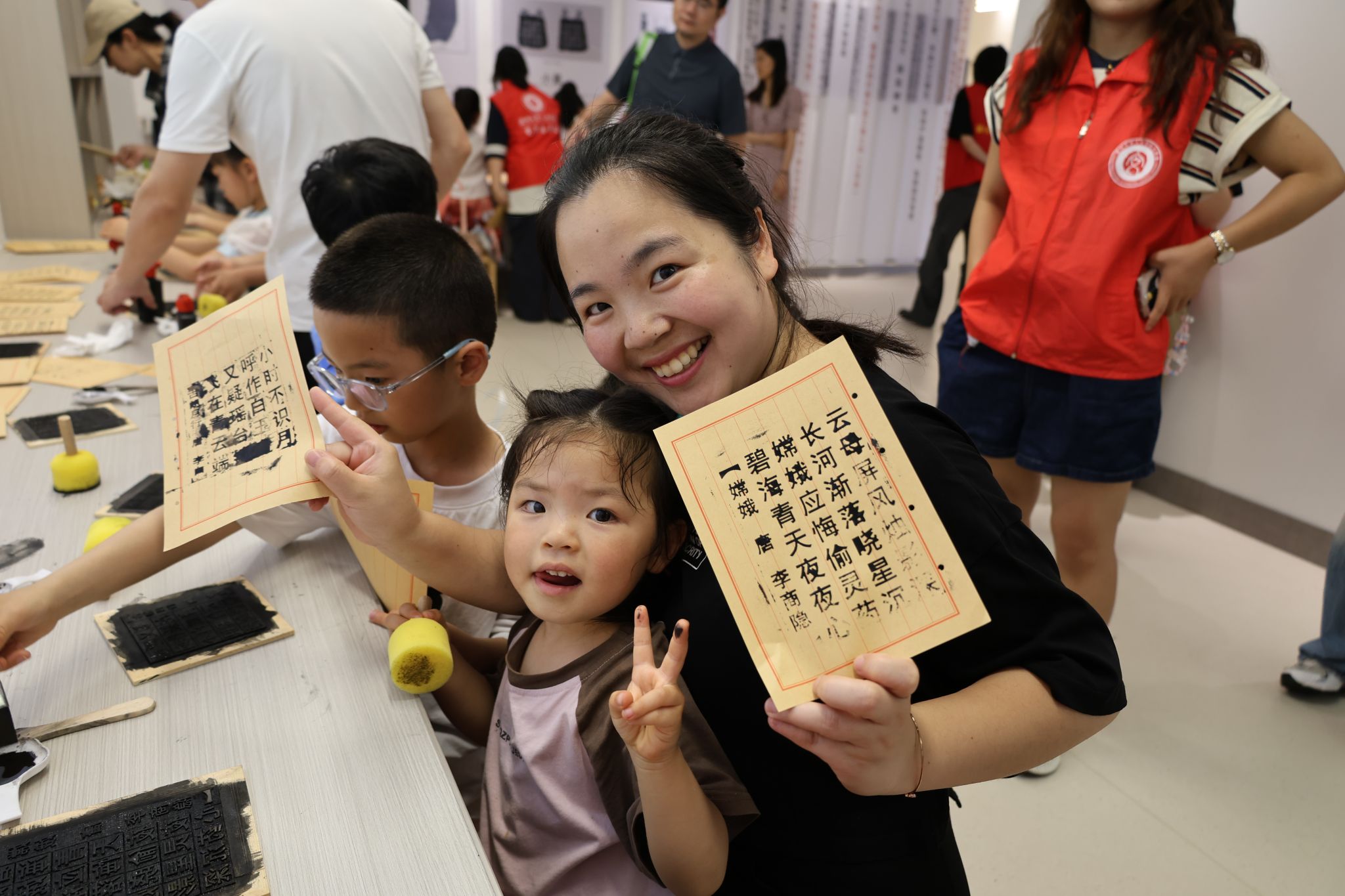 随后,大家进入木活字印刷体验区,孩子们在家长和志愿者的指导与帮助下,均匀刷墨、轻轻拓印,完成了木活字印刷初体验。油墨的清香在空气中弥漫,孩子们低头忙个不停,有的脸颊沾上了墨点,有的小手被染得乌黑,依然满脸笑意,沉浸在活字印刷的乐趣中。