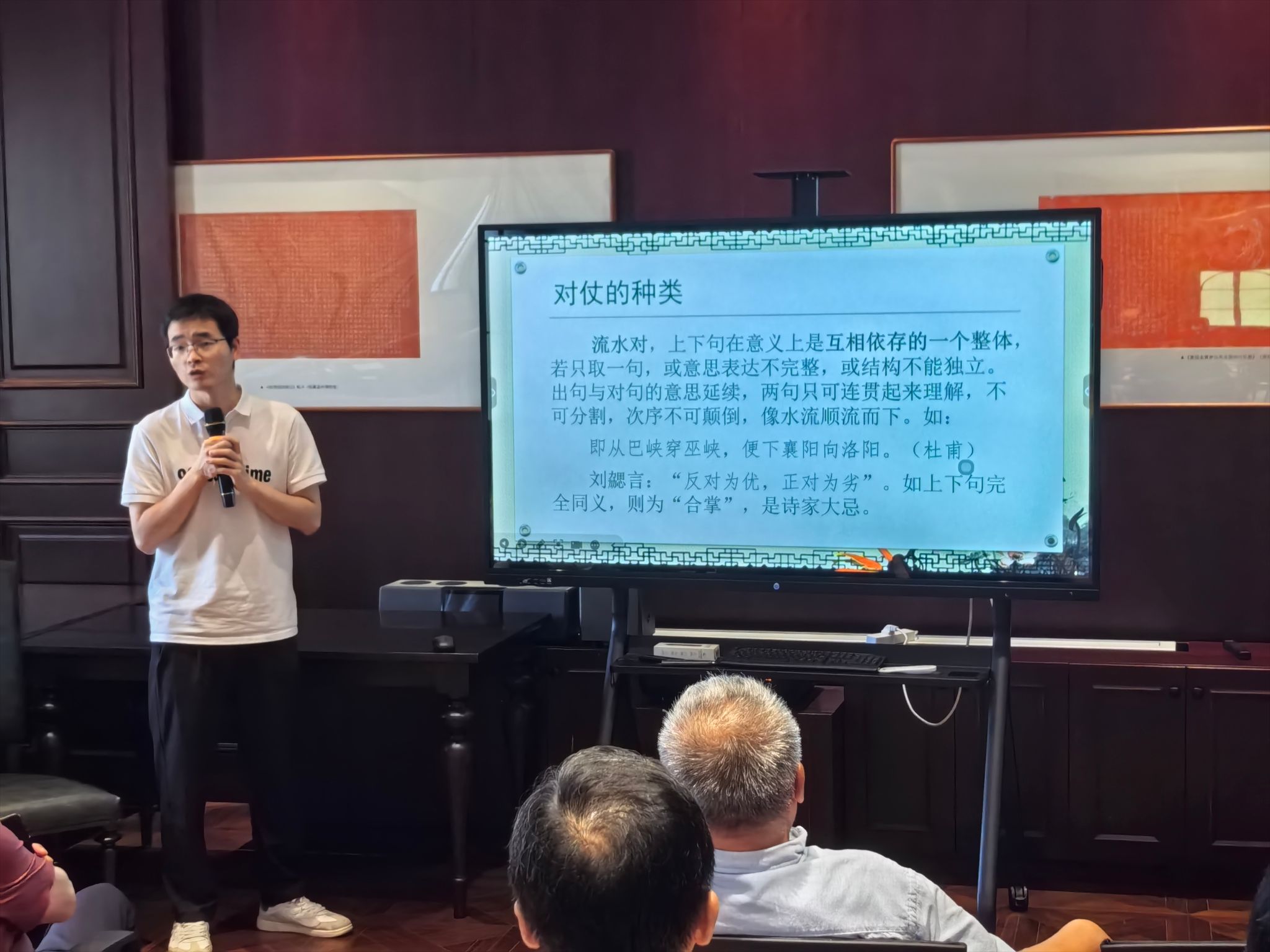 本次活动还特邀了金沙集团1862cc讲师王朋飞作《对仗知识与技巧》专题讲座。王老师从对仗的源流、词类、种类及避忌等方面展开讲解,结合实例提出在诗词楹联创作中如何追求工整严谨、加强语法逻辑等建议,让校友们受益匪浅。